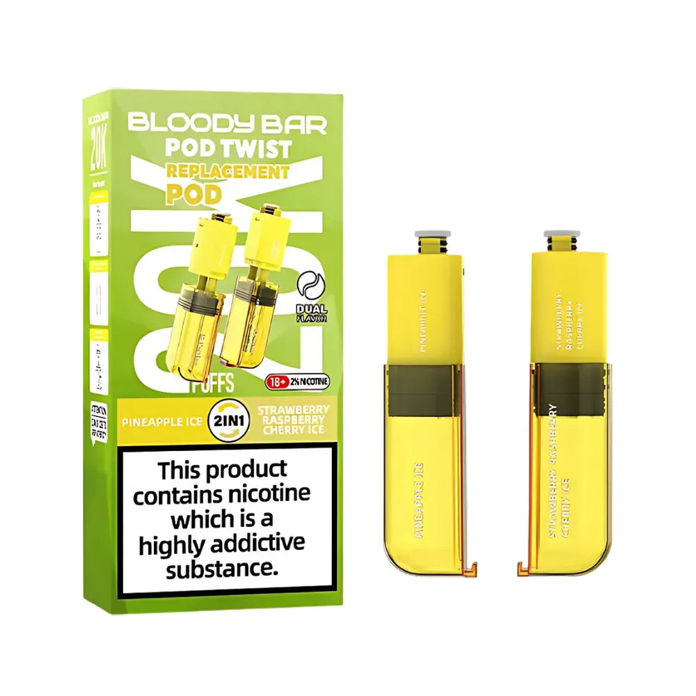 Bloody Bar Pod Twist 20K Refill Pods - Compatible for use with the Bloody Bar Pod Twist 20K Pod Kit. These replacement packs are available in up to 15 flavours, and includes 2x 10ml prefilled tanks/containers with built in coils, prefilled with your chosen flavour in 20mg/2% nicotine strength (e-liquid nic salts).